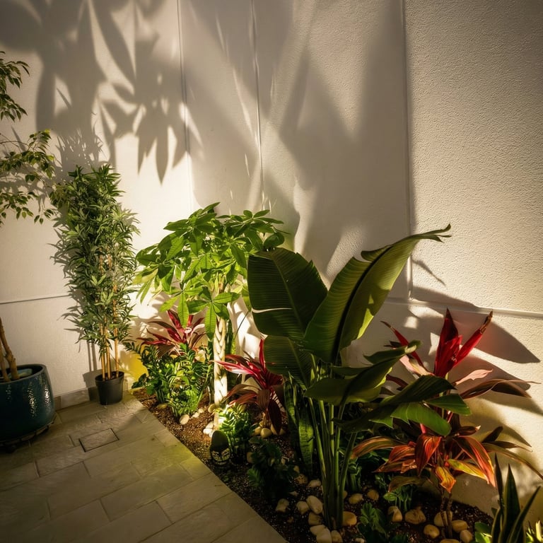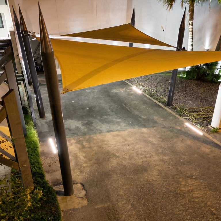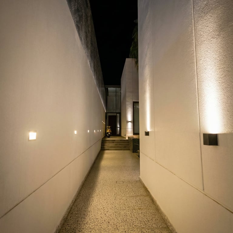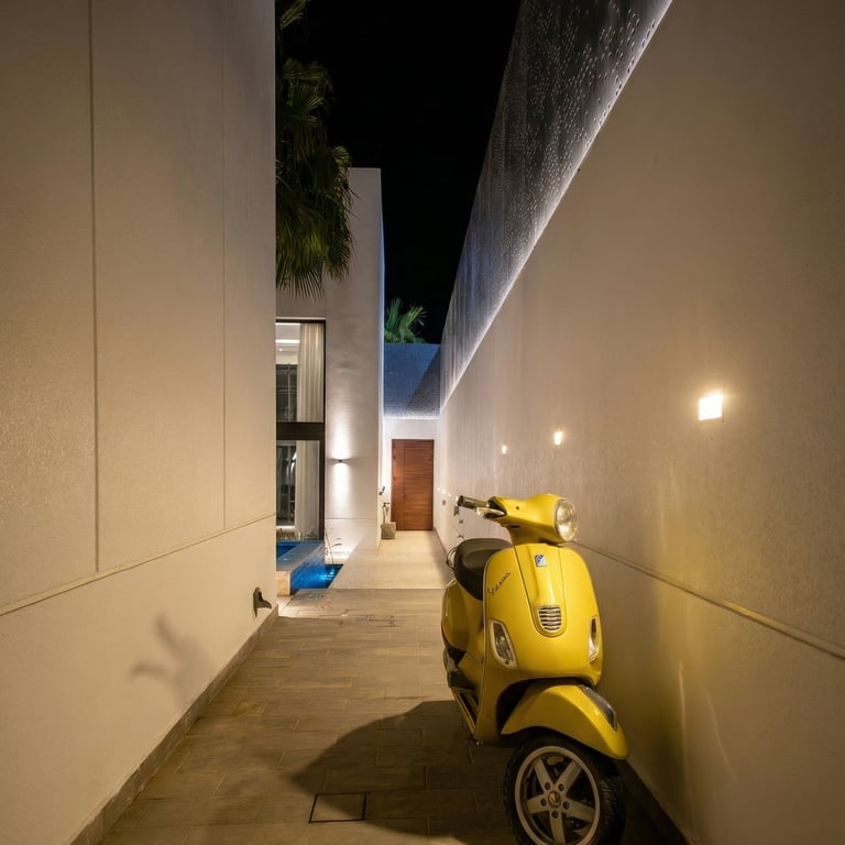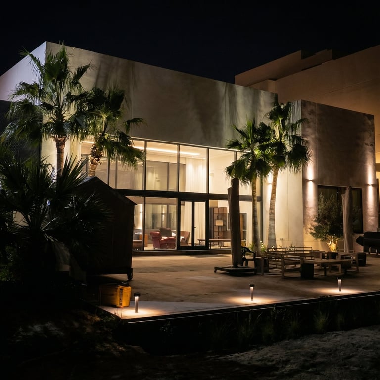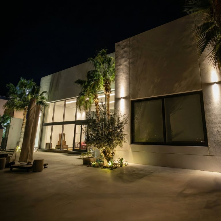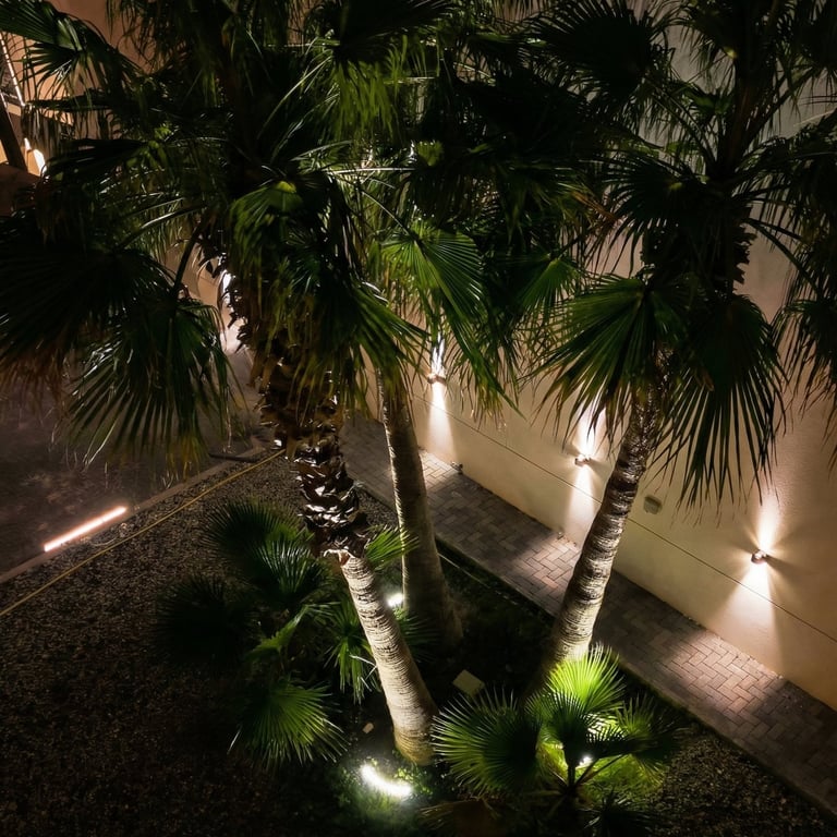 Warm 3000K lighting was carefully integrated across the façade, pathways, and outdoor living areas to create a seamless visual flow. Vertical wall washing highlights the clean geometry of the building, while soft uplighting brings the palm trees and greenery to life, adding texture and movement to the space.