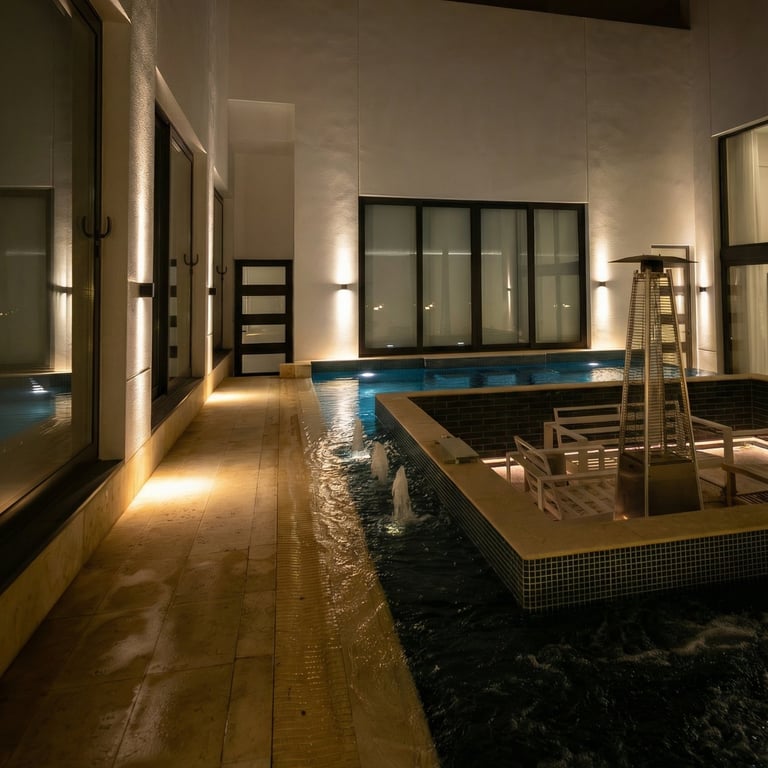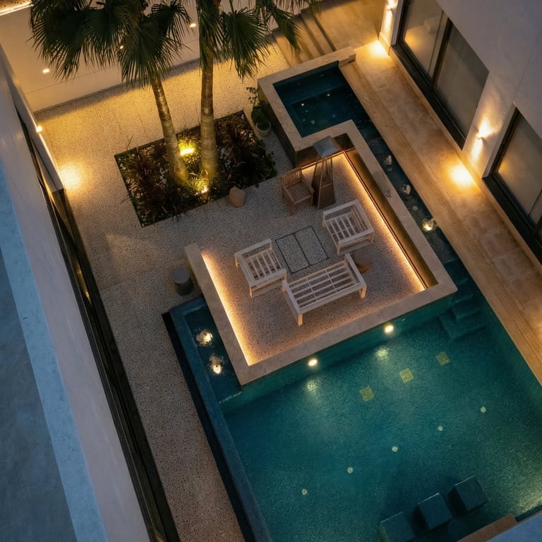 In the pool and courtyard areas, subtle concealed lighting and underwater illumination were used to create a calm, resort-like atmosphere. Path lighting and low-glare fixtures ensure safety without compromising the ambiance.