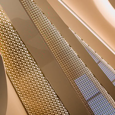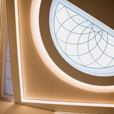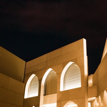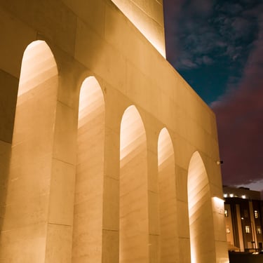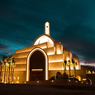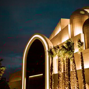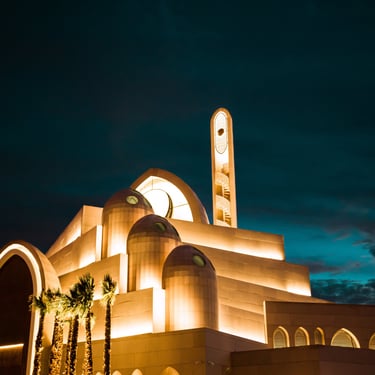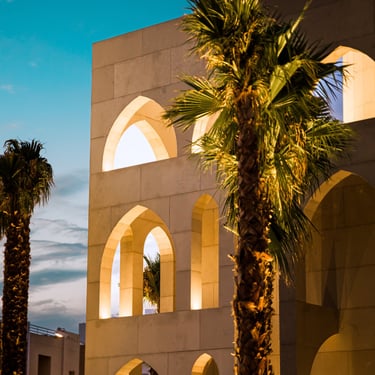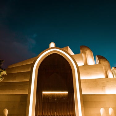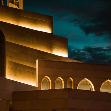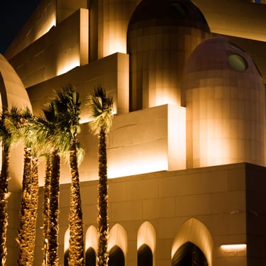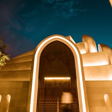 Integration of hidden architectural lighting to emphasize arches, skylights, and muqarnas details