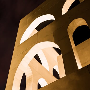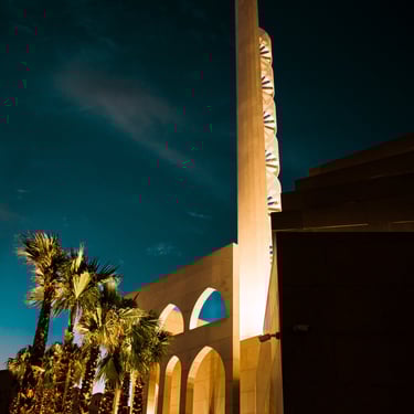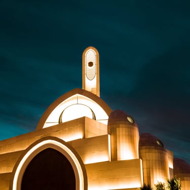 Inside the prayer hall, carefully positioned fixtures highlight the curvature of the lancet arches and Qur’anic inscriptions, creating a calm, spiritual glow. Outside, subtle façade lighting traces the geometric rhythm of the masses, giving the structure a majestic yet humble night presence.