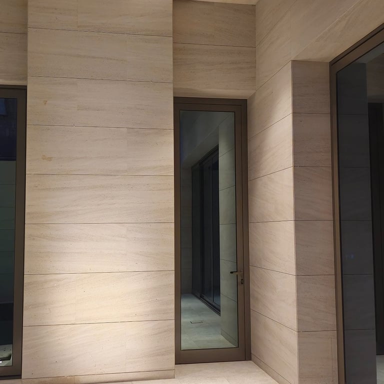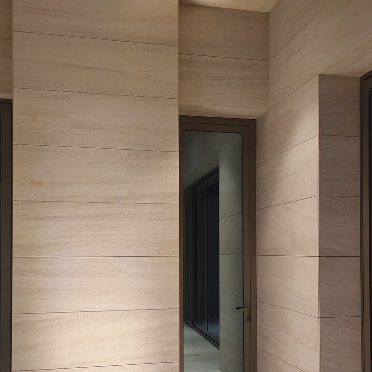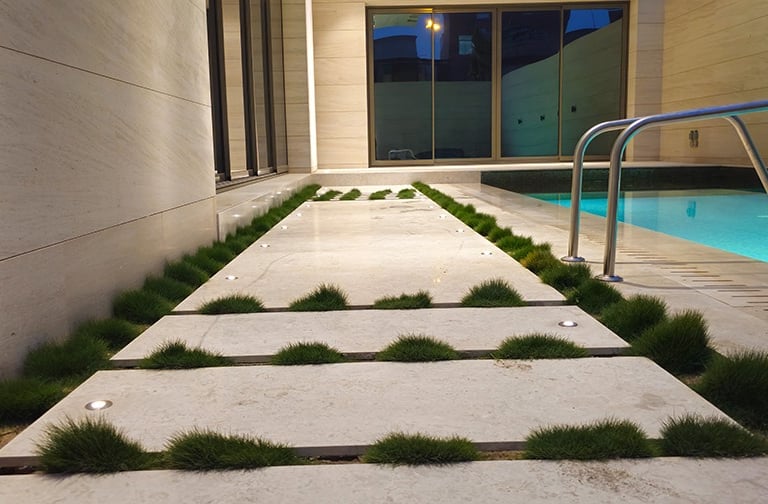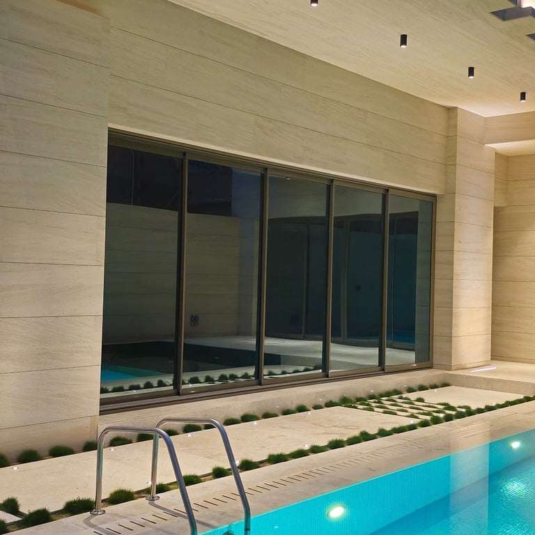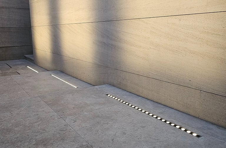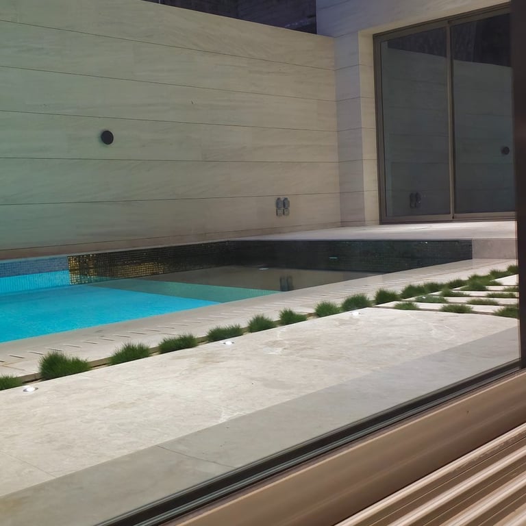 The courtyard and swimming pool lighting were carefully integrated to maintain visual harmony between façade illumination and landscape lighting, resulting in a refined residential atmosphere.