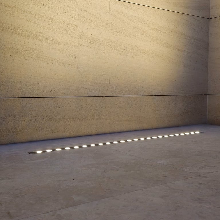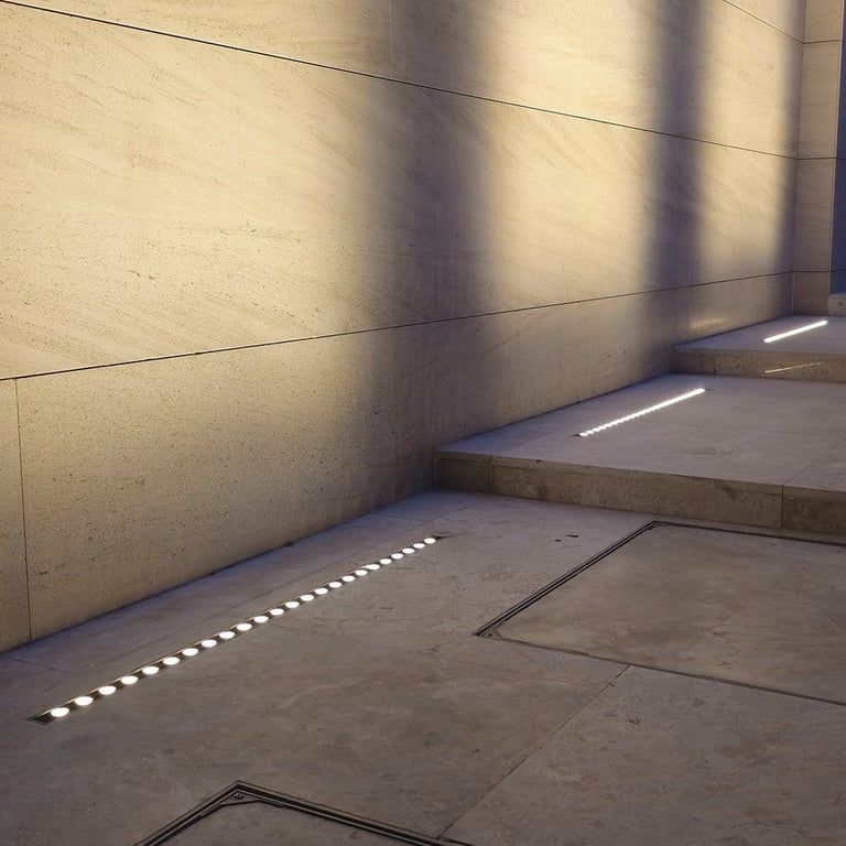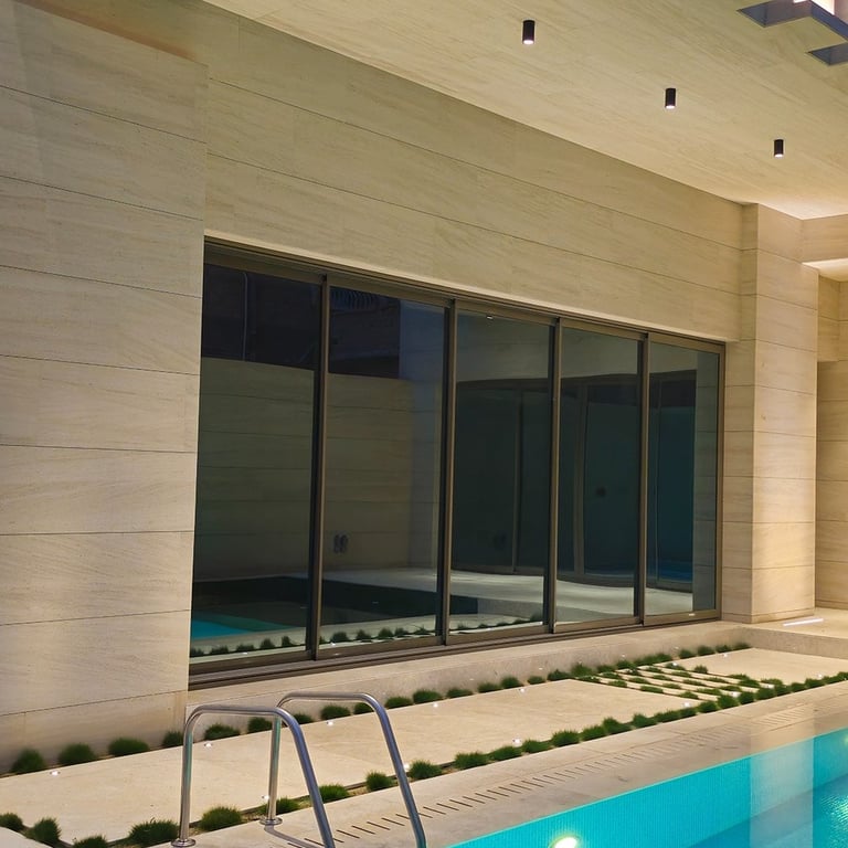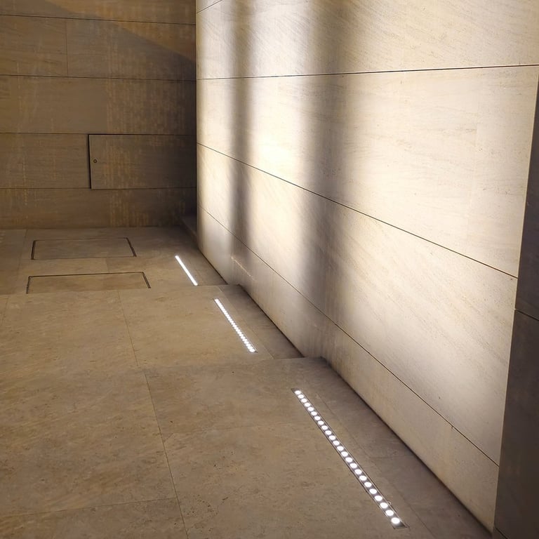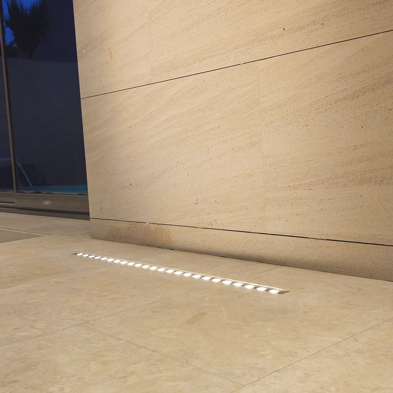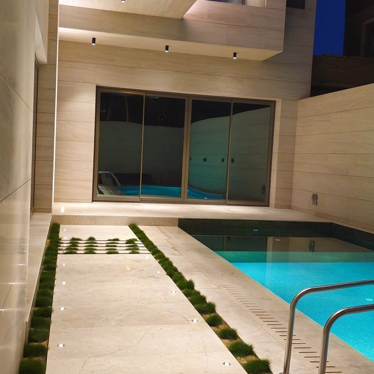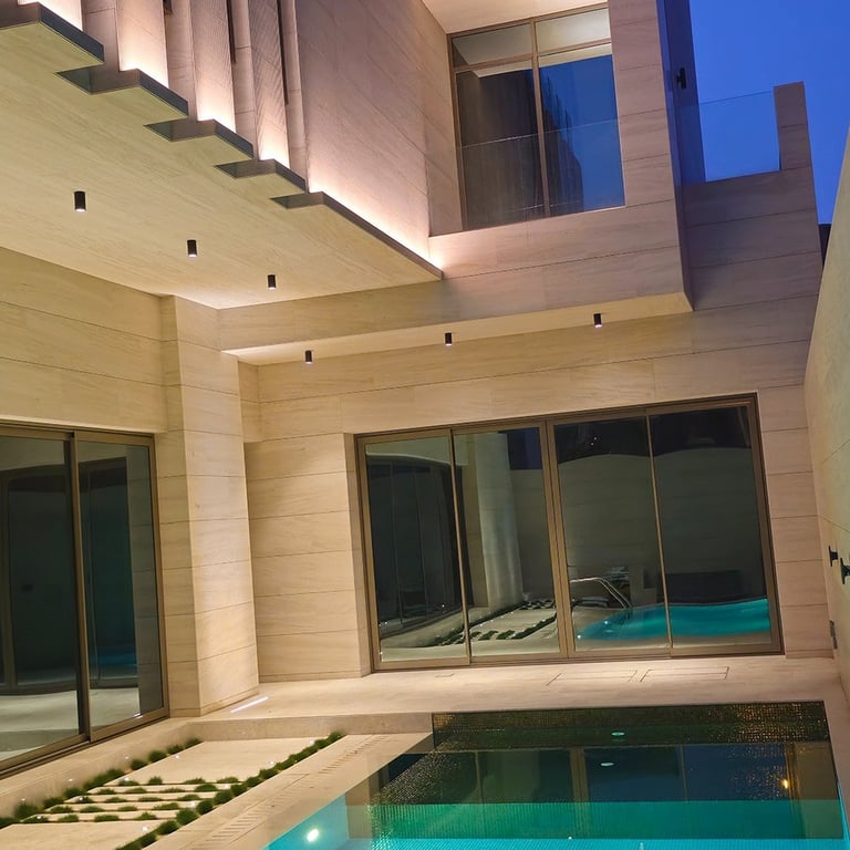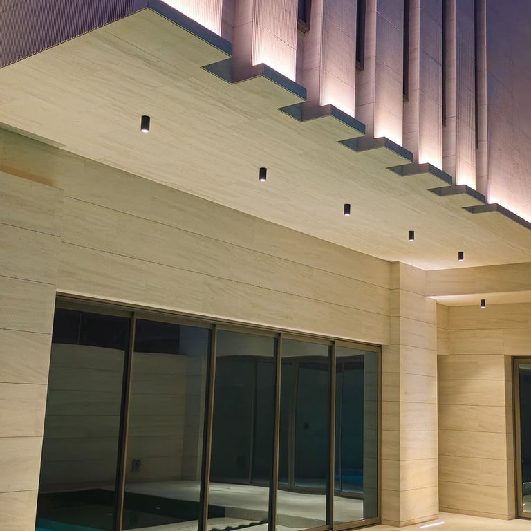 The lighting concept enhances the villa’s strong geometric architecture using concealed linear profiles, recessed downlights, and controlled wall-washing techniques. All fixtures were calibrated at 3000K warm white to create a premium, balanced evening ambiance without glare or overexposure.